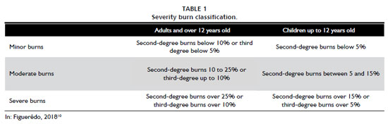 Burn severity is classified as small, medium or large burns. According to the table (Table 1). Additionally, large burns are defined as second- or third-degree burns in the perineum, or third-degree burns affecting the hands, feet, face, neck, or axilla10.