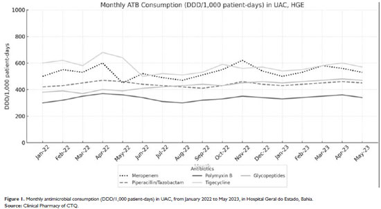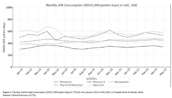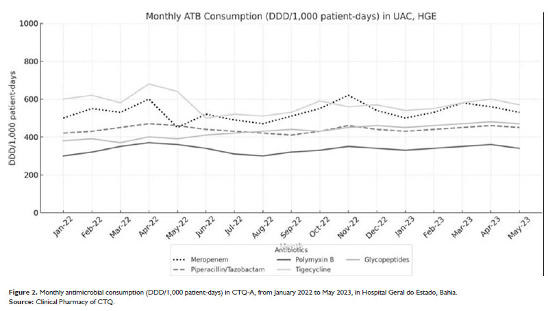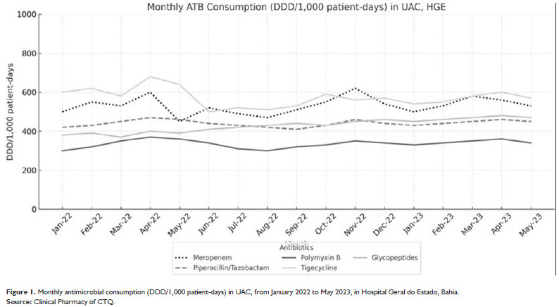 To calculate the standardized rate of antimicrobial consumption, the following formula was used: DDD per 1,000 patient-days = (Total amount of drug used in grams) ÷ (DDD × Total patient-days) × 1,000; where A = total antimicrobial consumed (in grams); B = standard daily dose of the antimicrobial (in grams); P = total number of patient-days during the surveillance month. This study was approved by Plataforma Bahia and the Institutional Research Ethics Committee (approval number: 5.494.951). The ethics committee waived the requirement for informed consent due to the retrospective nature of the study.