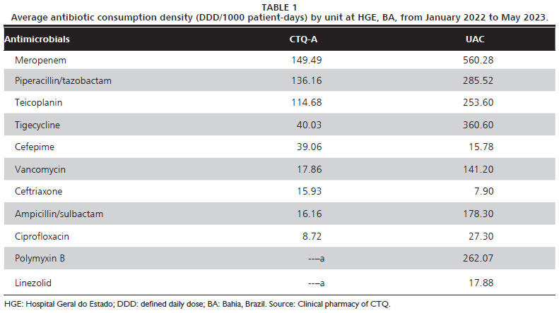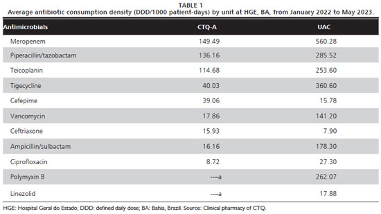 CONCLUSÕES: Apesar das diferenças nos perfis de resistência entre as unidades, meropenem, piperacilina/tazobactam, teicoplanina e tigeciclina foram os antibióticos mais utilizados em ambas.
