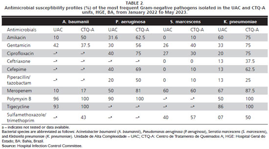 RESULTADOS: Entre janeiro de 2022 e maio de 2023, foram identificados 214 isolados bacterianos: 92 no CTQ-A e 122 na UAC. No CTQ-A, 43,5% dos isolados eram Gram-positivos, comparados a 17,2% na UAC. Os patógenos mais prevalentes no CTQ-A foram Staphylococcus aureus (29%), Pseudomonas aeruginosa (17,4%), estafilococos coagulase-negativos (13%), Serratia marcescens (10%) e Klebsiella pneumoniae e Acinetobacter baumannii (8,7% cada). Na UAC, predominaram A. baumannii (25,4%), P. aeruginosa (16,4%), S. marcescens e K. pneumoniae (12,3% cada), seguidos de S. aureus (9%). Microrganismos multirresistentes representaram 50% dos isolados no CTQ-A e 73% na UAC. Entre enterobactérias, a produção de beta-lactamase de espectro estendido foi detectada em 54% dos isolados do CTQ-A e 62% da UAC; já a resistência a carbapenêmicos foi de 25% e 53%, respectivamente. S. aureus resistente à meticilina ocorreu em 50% no CTQ-A e em 66,7% na UAC. Os antibióticos mais prescritos na UAC foram meropenem, tigeciclina, piperacilina/tazobactam, teicoplanina e polimixina B. No CTQ-A, destacaram-se meropenem, piperacilina/tazobactam, teicoplanina e tigeciclina.