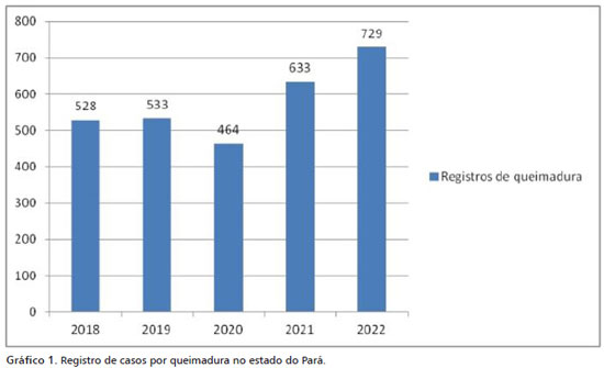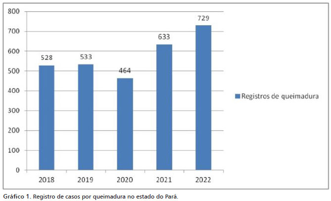 O estudo identificou o registro de 2.884 casos de internação de queimadura no estado do Pará no período de 2018 a 2022. Esse número geral foi estratificado por ano, demonstrando uma tendência de crescimento nos casos de queimaduras no estado, uma vez que 25,27% dos casos aconteceram em 2022, pois, desde 2020, ano que registrou o menor número de casos, com 464 (16,08% do total), houve um crescimento contínuo, com 169 casos a mais em 2021, registrando-se 633 casos, e mais 96 casos em 2022, ano que atingiu o maior número de casos durante o período analisado, com 729 casos no total (Gráfico 1).