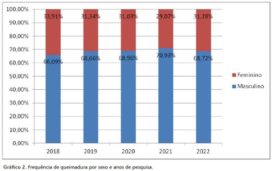 No ano de 2021 houve o maior registro de casos de homens internados por queimaduras (70,93%). Já no caso das mulheres, o ano de 2018 foi o que abarcou o maior número de ocorrências (33,91%) e, neste período, houve manutenção no padrão próximo de acometimento nos homens e, consequentemente, nas mulheres, pois, no período, a diferença entre os sexos variou apenas em 4,84%.