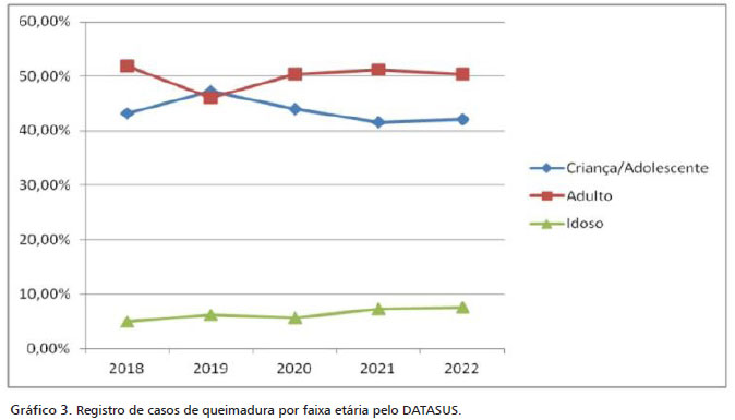 Considerando a divisão para esse trabalho, o grupo de crianças e adolescentes apresentou maior registro de queimaduras no ano de 2019, com a taxa de 47,27%. Quanto aos adultos, a maior frequência aconteceu no ano de 2018, com 51,80%; já o público de idosos teve maior apontamento no ano de 2022, com 7,54%.
