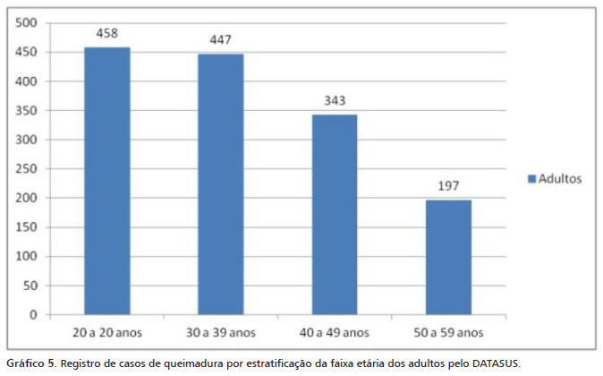 Entre a população adulta8, o sexo que prevalece em casos de queimaduras é o masculino, e a faixa etária predominante é de 21 a 30 anos de idade, representando, principalmente, a população economicamente ativa. Já quando analisado o público de mulheres adultas, a maioria dos casos ocorrem no ambiente doméstico, decorrente das tentativas de autoextermínio e dos casos de violência doméstica5.
