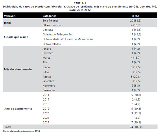 A Tabela 1 apresenta os resultados quanto a faixa etária, cidade de residência, mês e ano de atendimento. A maioria dos idosos tinha entre 60 e 79 anos, residiam na cidade sede do PSA e em outras cidades do Triângulo Sul. Predominaram os atendimentos ocorridos no mês de agosto e no ano de 2022.