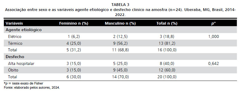 Para avaliar a associação entre sexo e as variáveis agente etiológico e desfecho clínico, foi utilizado o teste Exato de Fisher. Apesar de os homens terem sido mais acometidos tanto pelo agente elétrico quanto pelo térmico e tendo como desfecho o óbito três vezes mais do que as mulheres, estas diferenças não foram estatisticamente significativas (p<0,05), conforme apresenta a Tabela 3.