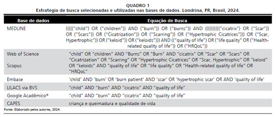 Utilizou-se a estratégia população, conceito e contexto (PCC)9 para elaboração da pergunta de pesquisa: P - crianças de zero a 9 anos incompletos que possuíam cicatriz de queimaduras, C - Repercussões de qualquer natureza, após o incidente de queimadura, que alterassem o curso natural da vida, gerando alterações físicas e psicológicas, tanto na vida da criança, como de seus pais/cuidadores, C - Não houve limitação geográfica, sendo considerados estudos de qualquer localidade mundial. A questão orientadora foi: Quais as evidências científicas sobre as repercussões das cicatrizes de queimaduras em crianças?