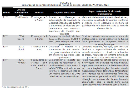 Embora esta revisão de escopo não tenha definido um limite temporal, foram identificados apenas quatro estudos que investigaram as repercussões das cicatrizes de queimaduras em crianças, a partir do ano de 2014, evidenciando a escassez de pesquisas sobre o assunto.